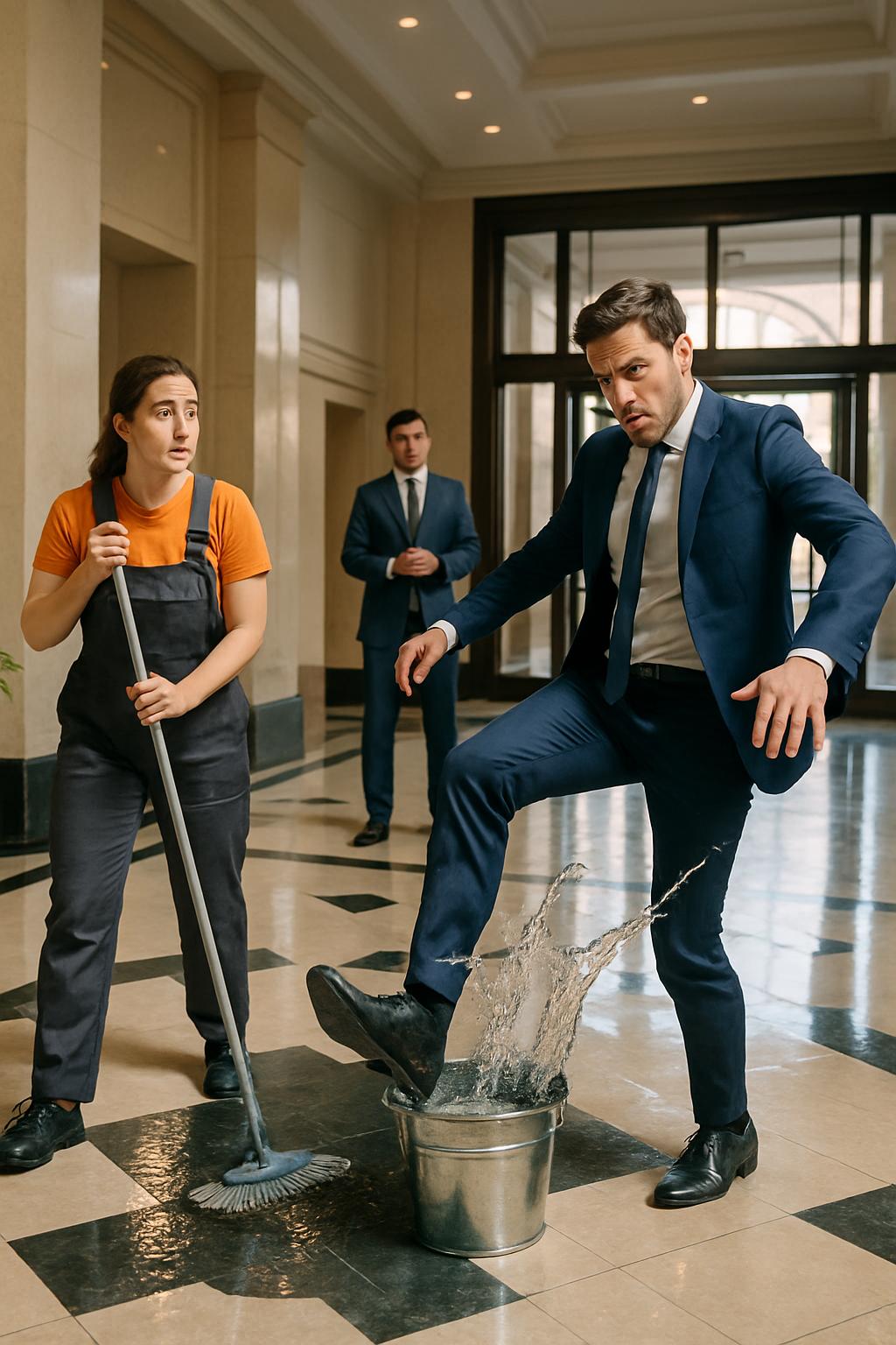 No one reacted—neither the security guards nor the receptionists. Margaret, without saying a word, picked up the bucket and continued cleaning the floor.